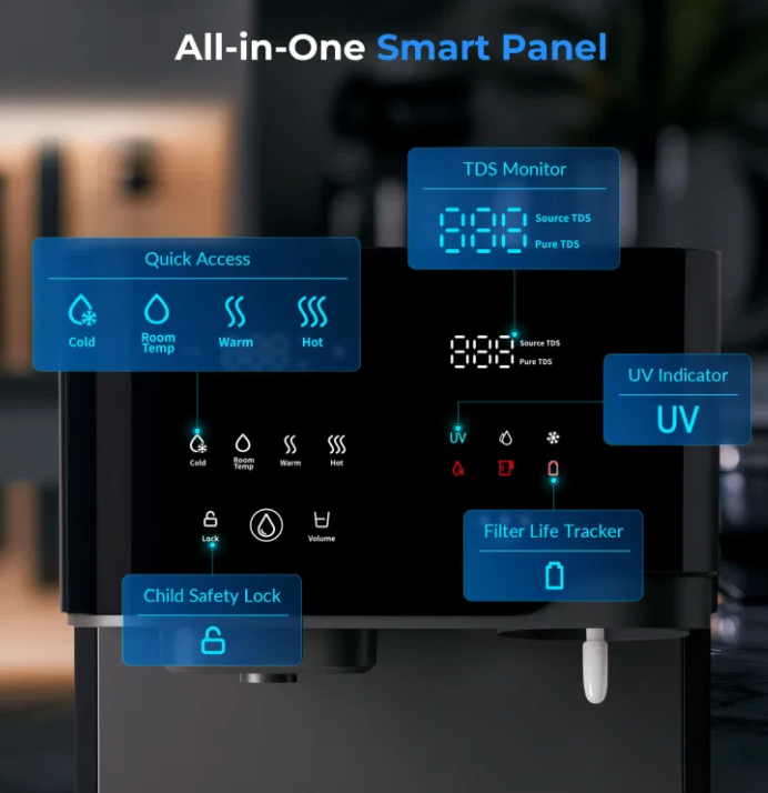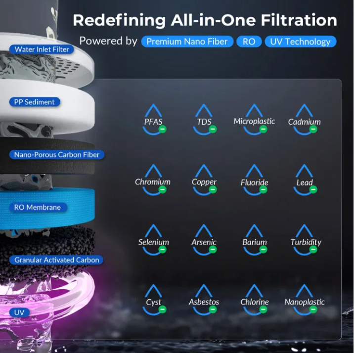 For an extra layer of protection, the system includes integrated UV water sterilization that helps neutralize microorganisms that may be present in water such as e-coli, viruses, and bacteria. UV treatment is commonly used in advanced water purification systems because it helps disinfect water without chemicals or added taste.